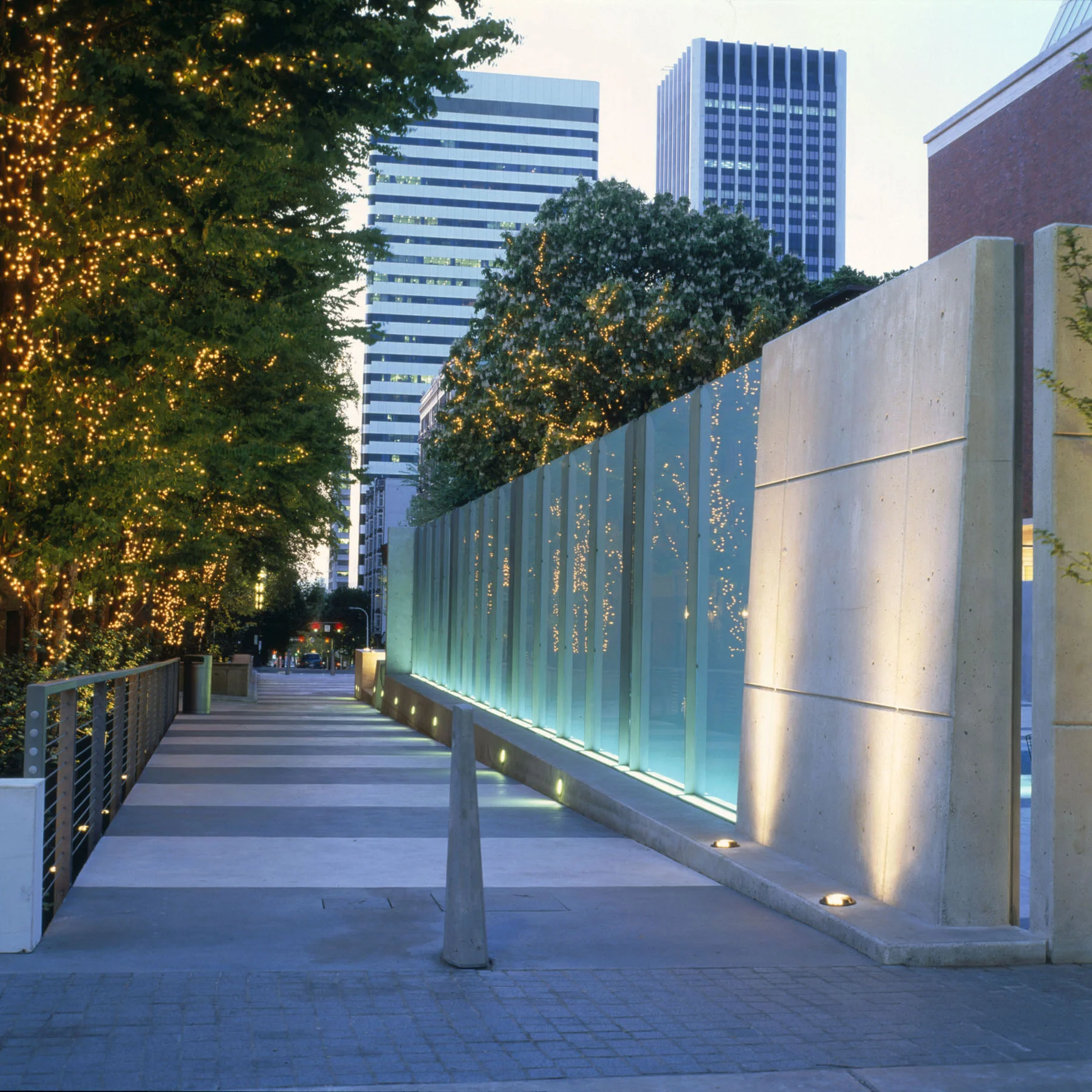 This structural steel design for the public infrastructure included benches, movable steel display platforms for sculptures, pigmented concrete walks, and sculptural structural elements. An edge-lit ten-foot-high cantilevered glass wall softly delineates the courtyard's boundaries.